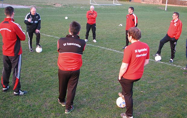 Mit großem Engagement nahmen auf dem Sportgelände in Eggelstetten zwölf Jugendtrainer bzw. -betreuer der Fußball-Spielgemeinschaft Eggelstetten/Oberndorf an einer Fortbildung teil. Beiden Vereinen ist es wichtig, durch Weiterbildung die Qualität der Trainingseinheiten in allen Altersgruppen zu verbessern. Für die Durchführung der Qualifizierungsveranstaltung konnte Jugendleiter Kurt Jung DFB-Stützpunkttrainer Günther Reichherzer aus Rain engagieren. Im ersten Teil durften die Protagonisten Übungen aus dem FIFA-Aufwärmprogramm „11-Plus“ praktizieren. Anschließend wurde die korrekte Schusshaltung für das Passen mit der Innenseite geschult. Weitere Übungseinheiten waren situatives Verhalten bei der Verteidigung. Im theoretischen Teil wurden an einer Magnettafel taktische Vorgehensweisen bei bestimmten Spielsituationen gemeinsam analysiert. Günther Reichherzer gab zum Schluss noch Empfehlungen und Anregungen mit auf den Weg, wie das Erreichen eines Lernziels am effektivsten geübt werden könne. Durch seine Kompetenz bot Günther Reichherzer allen Teilnehmern eine sehr gelungene und abwechslungsreiche Trainerfortbildung.